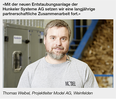 Die Model AG in Weinfelden hat die Staubproblematik erkannt. Seit Oktober 2024 druckt das Unternehmen auf einer Chroma X Pro 2100, eine Wellpappendruckmaschine von Koenig & Bauer Celmacch mit sieben Flexodruckwerken. Die Druckmaschine ist an eine Entstaubungsanlage der Hunkeler Systeme AG angeschlossen. Die staubhaltige Luft wird an der Maschine abgesaugt, gefiltert und in gereinigtem Zustand an die Produktionsumgebung zurückgegeben. Es ist die modernste von mehreren Entstaubungsanlagen, die bei der Model AG zu einem sauberen Raumklima beitragen. Der in den Filtern zurückgehaltene Staub wird in Behältern gesammelt und entsorgt.