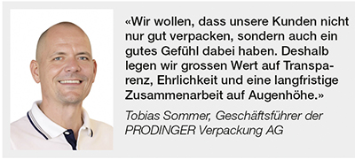 «Wir wollen, dass unsere Kunden nicht nur gut verpacken, sondern auch ein gutes Gefühl dabei haben», sagt Tobias Sommer, Geschäftsführer der PRODINGER Verpackung AG. «Deshalb legen wir grossen Wert auf Transparenz, Ehrlichkeit und eine langfristige Zusammenarbeit auf Augenhöhe.»