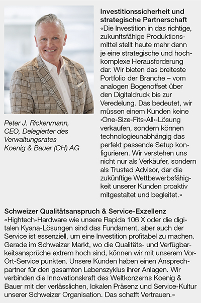 Die Zukunft der Verpackungsproduktion liegt nicht in isolierten Insellösungen. Koenig & Bauer demonstriert, wie ein integrierter Ansatz aussieht: Kyana liefert die Datenhoheit, Vision & Protection garantiert die Produktsicherheit und die Hardware von der Rapida über CI-Flexo und RotaJET bis zur Weiterverarbeitung sorgt für die industrielle Umsetzung. Für den Verpackungsdrucker bedeutet dies: maximale Prozesssicherheit und eine drastische Reduktion der Komplexität durch einen einzigen Technologiepartner. Sie erhalten somit alle notwendigen Werkzeuge aus einer Hand, um vom reinen Fertiger zum strategischen Partner Ihrer Kunden zu werden und die Brand Owner auf der Suche nach innovativen, aktivierenden Verpackungslösungen zu unterstützen.