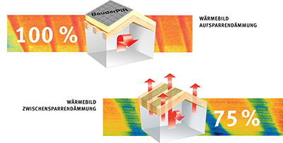 Über die grossen Dachflächen geht die meiste Energie verloren. Und genau hier lässt sich am effizientesten, einfach und sauber von aussen dämmen, im Neubau und bei der energetischen Sanierung. Nur Faserdämmstoffe im Dachgeschoss zwischen den Sparren reichen für die heutigen Ansprüche nicht mehr aus. Als Aufsparrendämmung oder zusätzliche Überdämmung eignen sich idealerweise druckfeste Dämmstoffe mit möglichst hoher Dämmleistung.