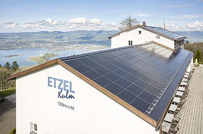 Naturfreunde und Sportbegeisterte erfreuen sich ganzjährig am Restaurantbetrieb des Berggasthauses Etzel Kulm im Kanton Schwyz. Nach einem Hagelschaden entschloss sich die zuständige Genossenschaft Hoch-Etzel dazu, das sanierungsbedürftige Objekt aus den 60er Jahren einer «Radikalkur» zu unterziehen. Mit dem Blick auf den Leitsatz «Möglichst viel Natur auf dem Etzel Kulm» wurde die hocheffiziente und ressourcenschonende Photovoltaikanlage Sunskin roof installiert.
